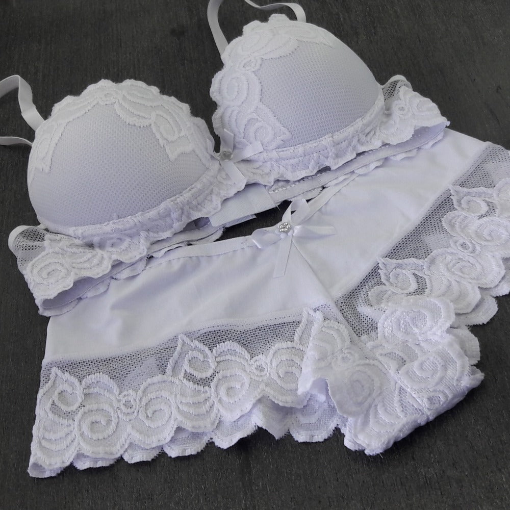 Detalhes em ondulações e um delicado lacinho no entremeio elevam a peça, trazendo um ar de sofisticação ao visual. A calcinha modelo caleçon, com transparência sutil, completa o conjunto com elegância e segurança.